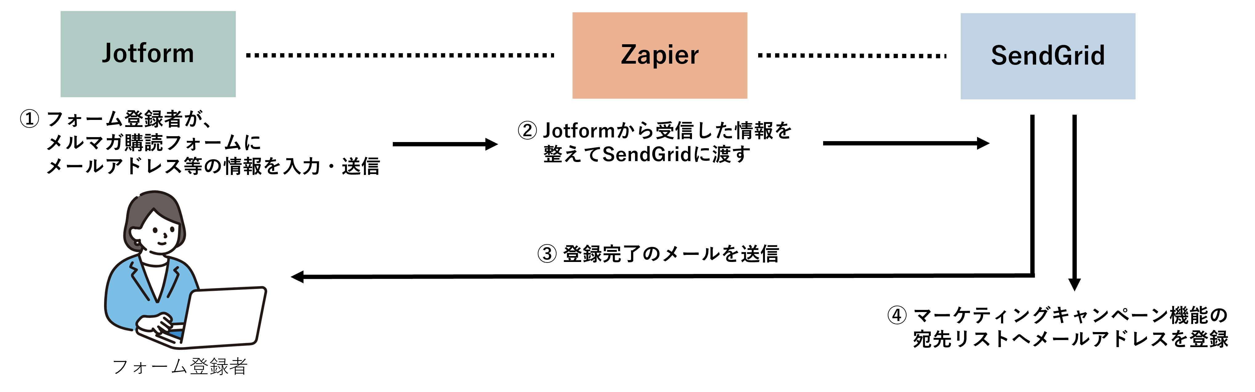 そこで今回は、「Jotform」、「Zapier」、「SendGrid」を組み合わせてメールマガジンの購読フォームをノーコードで作成する方法を紹介します。
