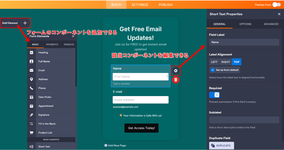 編集画面が表示されたら各コンポーネントを編集し、フォームを作成しましょう。