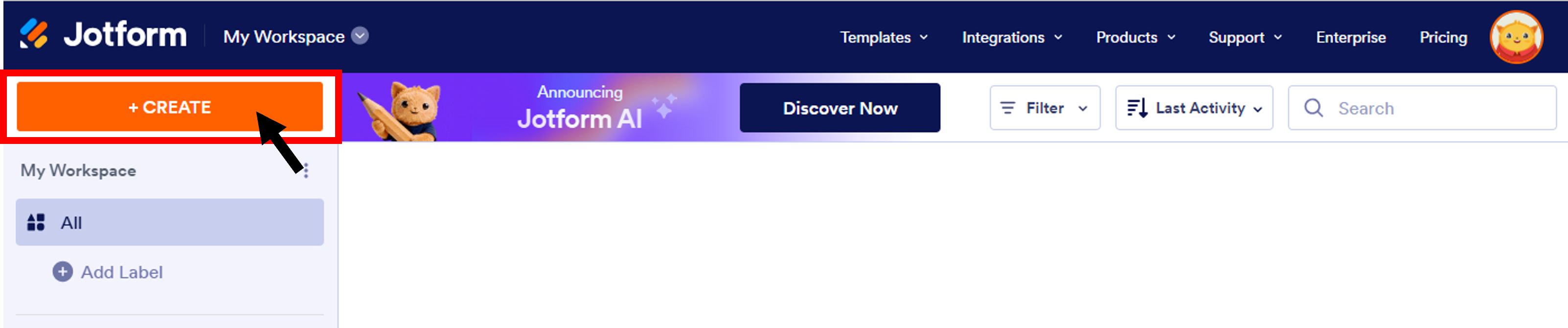 Workspaceにアクセスし、「+CREATE」を選択後、画面左下にある「Form」を選択します。