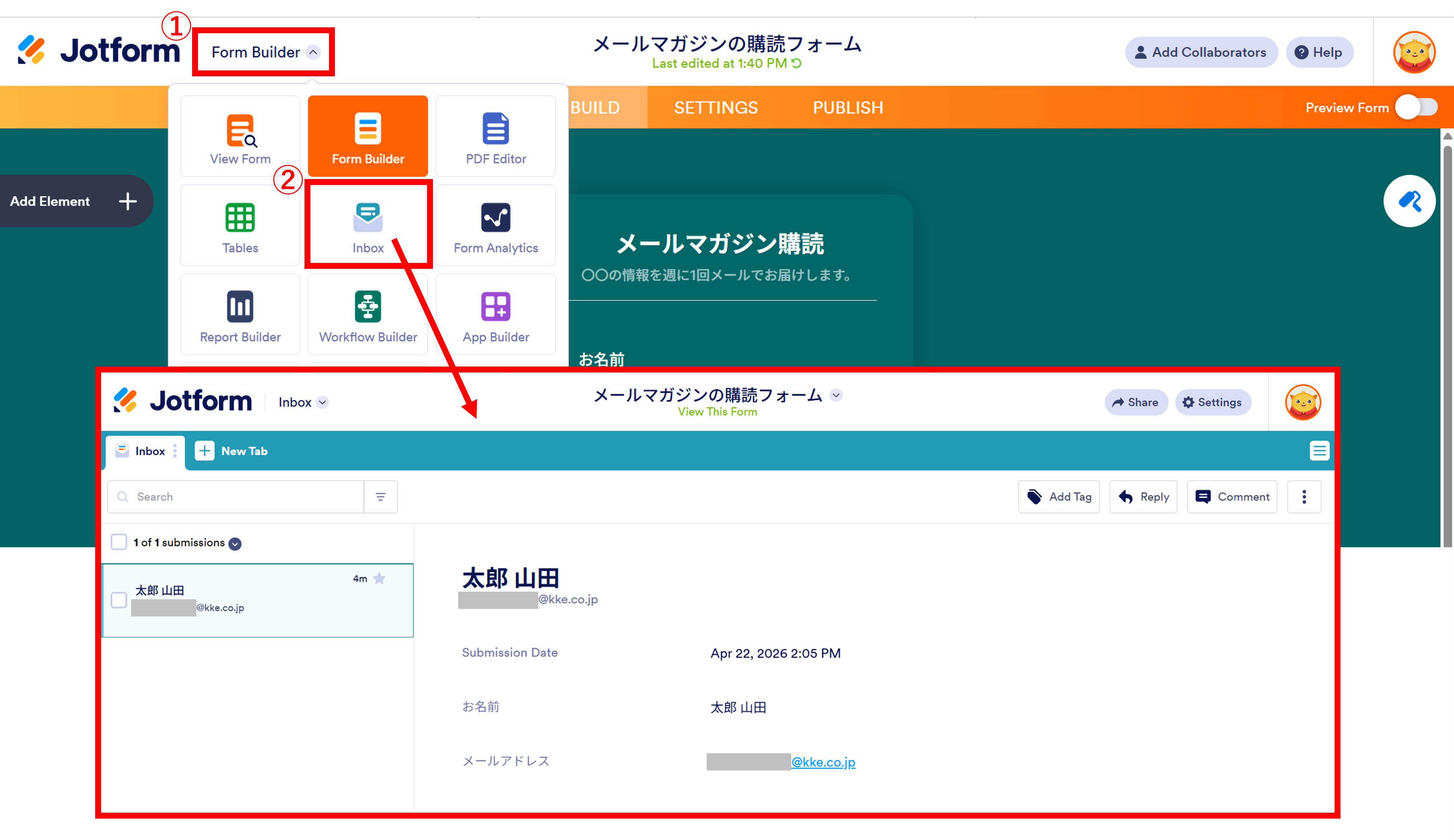 フォームに登録された内容は、Form BuilderのInboxにて確認できます。