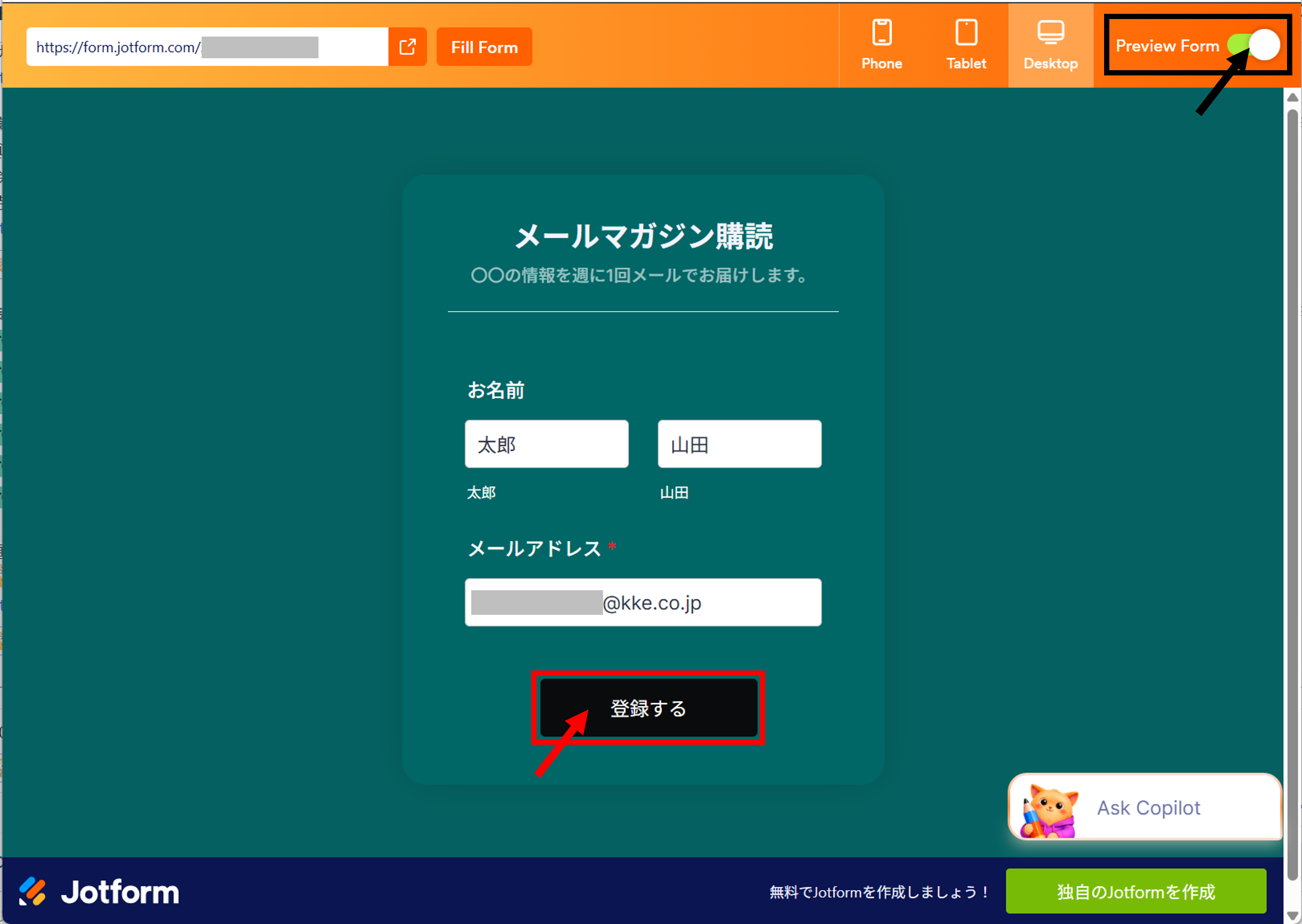 画面右上の「Preview Form」をONにし、プレビュー画面が表示されたら各項目に適当な情報を入力します。ボタン(下図の「登録する」ボタン)をクリックし、登録完了ページが表示されることを確認します。