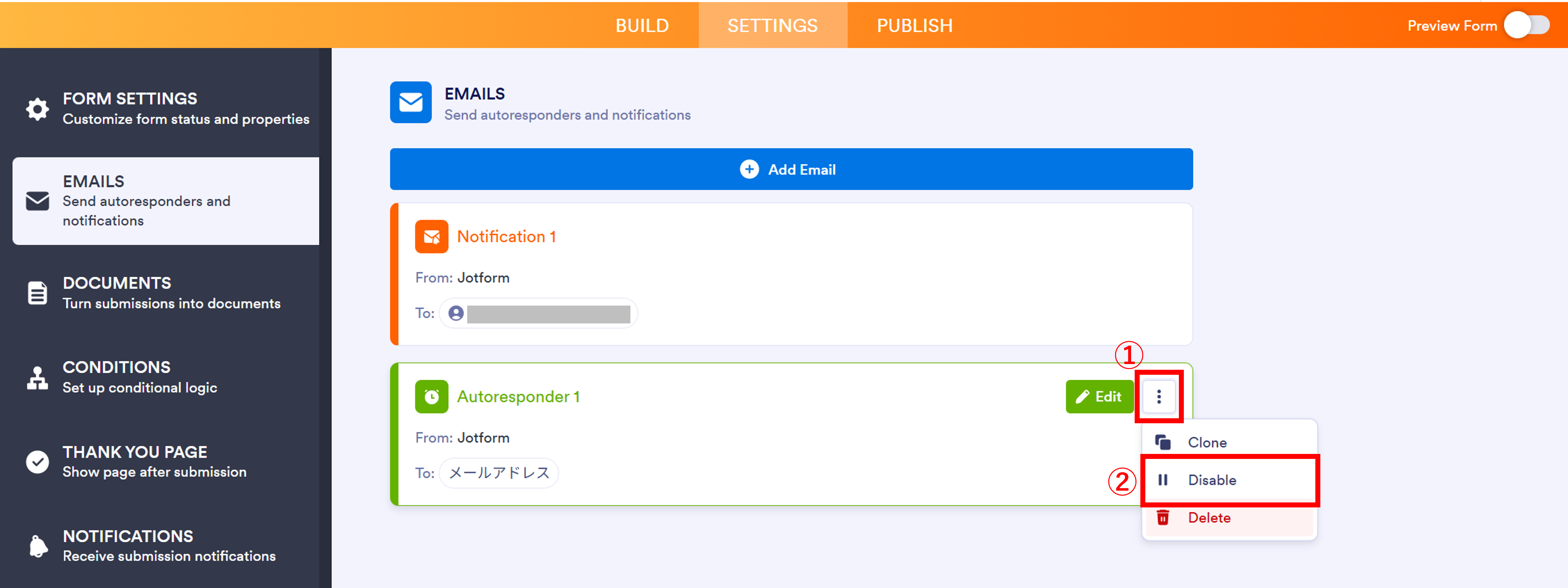 フォームが送信されると、フォームの送信者宛てにJotformのメールサーバから自動応答メールが送られるようデフォルトで設定されています。今回はSendGridから通知メールを送信するため、この機能は無効にします。EMAILSメニューの「Autoresponder(自動応答メール設定)」をDisableに変更しましょう。