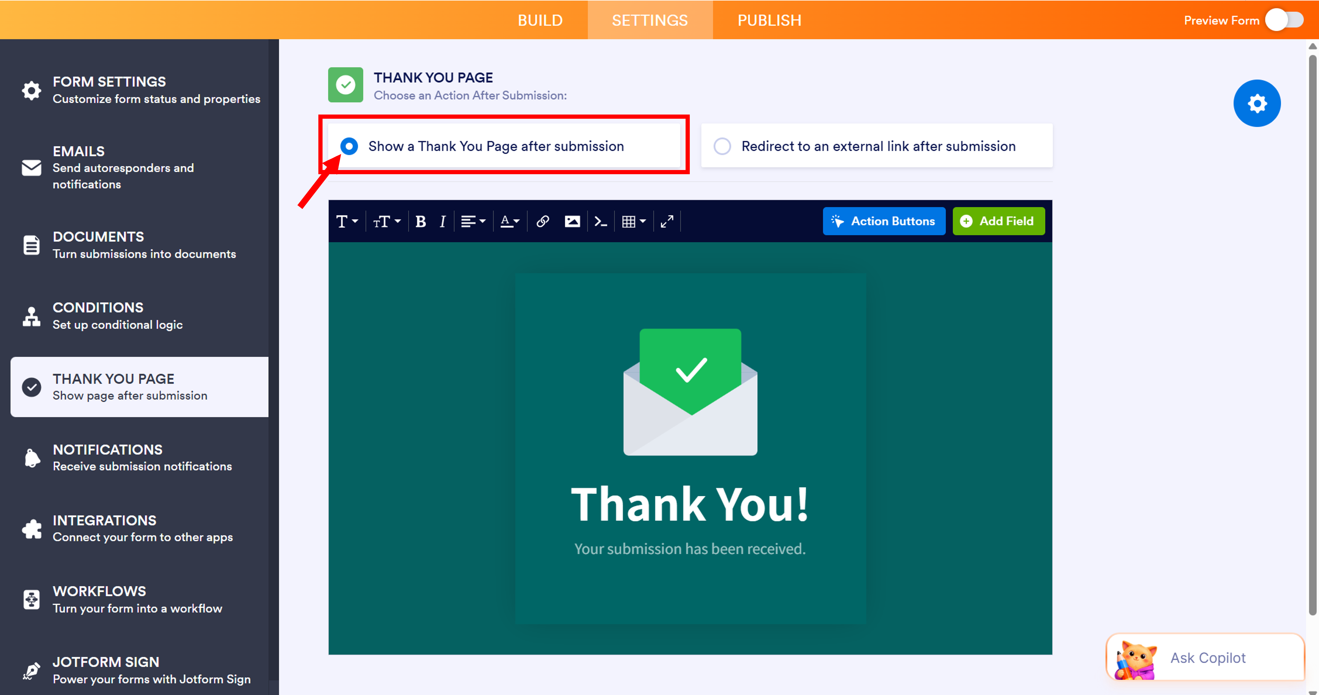 THANK YOU PAGEメニューでは、フォーム送信後のアクションを設定できます。今回は、フォーム送信後に登録完了ページを表示するよう「Show a Thank You Page after submission」を選択します。THANK YOU PAGEの詳細については、こちらのドキュメントもご参照ください。
