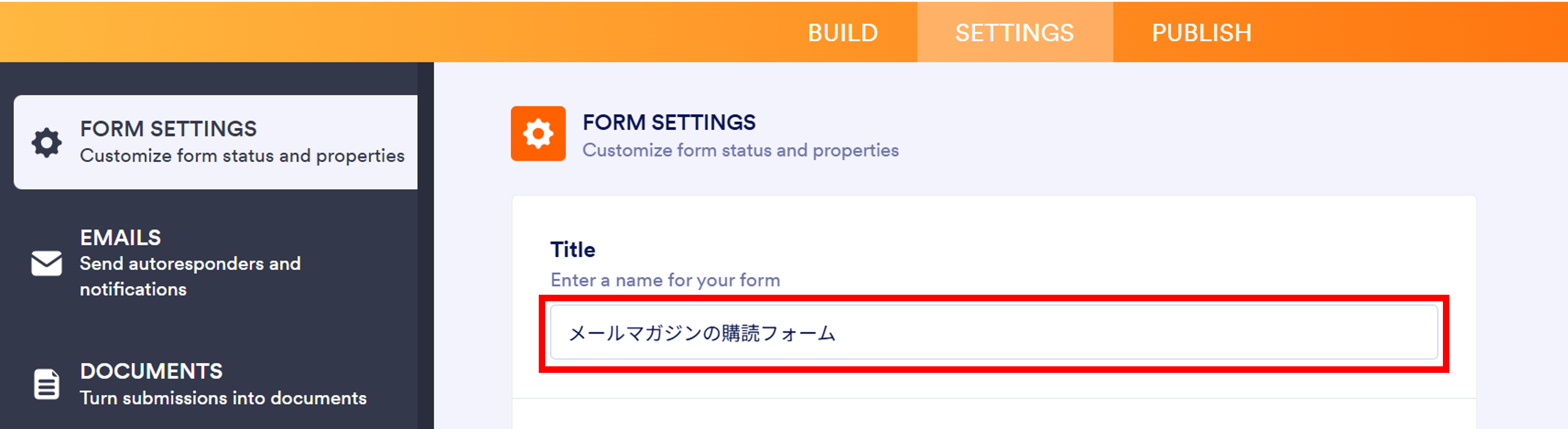 WorkspaceのWebフォーム一覧で表示されるタイトルを初期設定のもの(「Opt-In Form-Get Free Email Updates!」)から変更したい場合は、FORM SETTINGSメニューの「Title」で任意の名称に変更してください。ここでは、「メールマガジンの購読フォーム」に変更します。