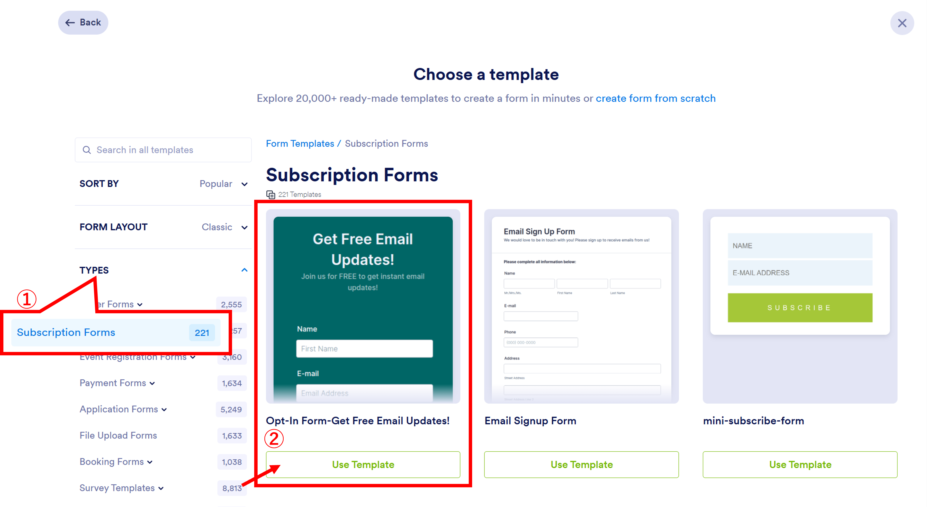 Jotformで提供されているテンプレートを利用し、メールマガジンの購読フォームを作成します。手順は以下の通りです。