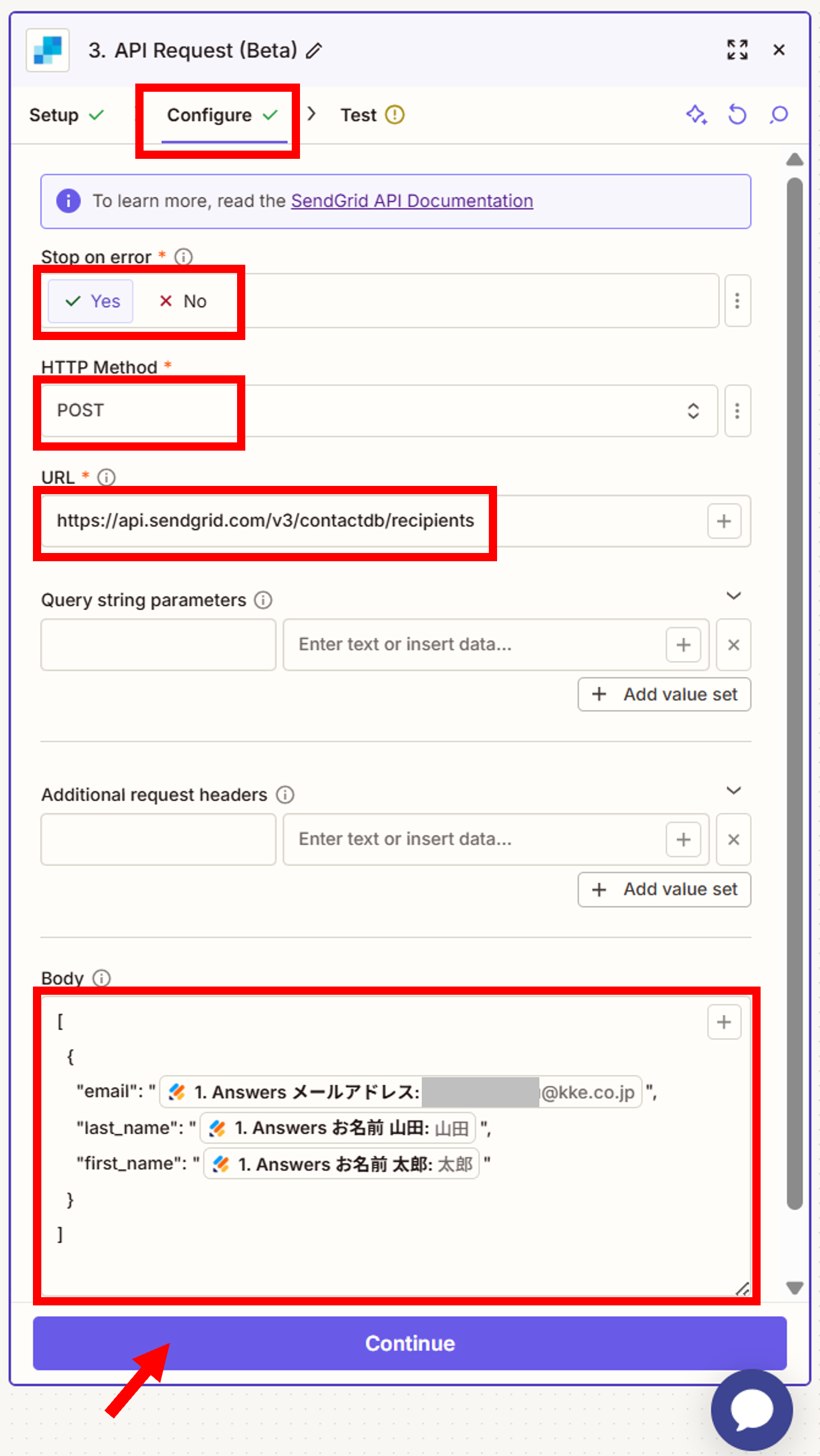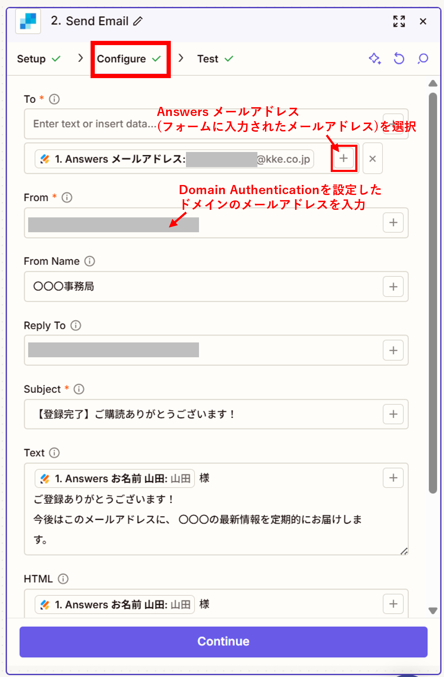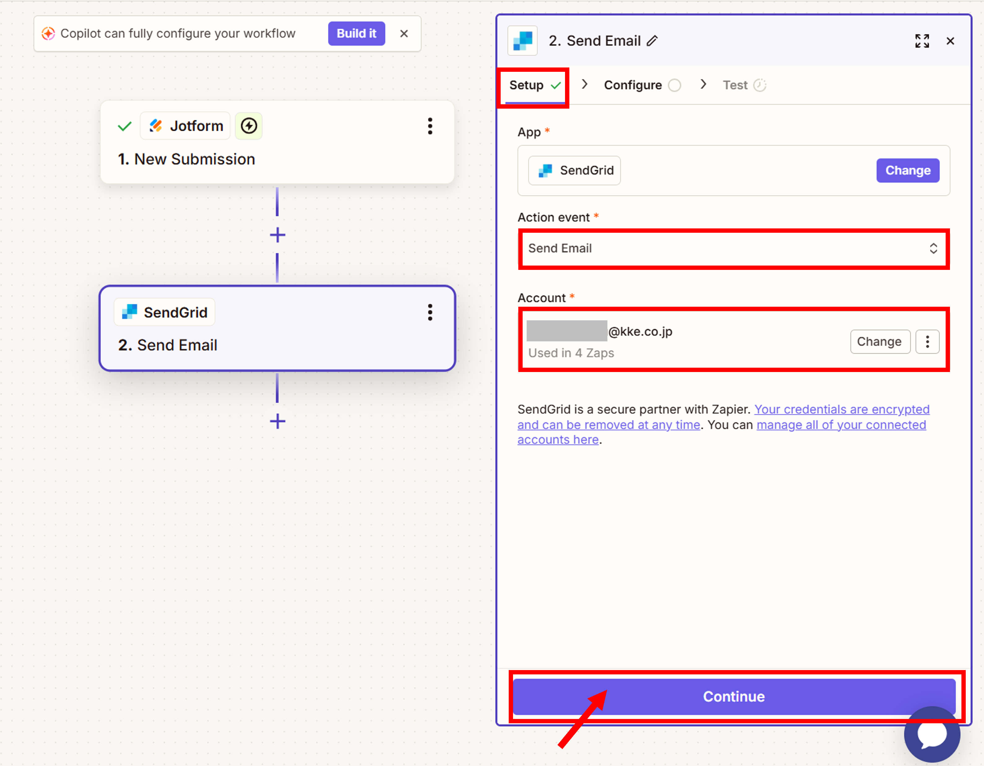 「Setup」で実行する処理と連携するSendGridアカウントを指定し、「Continue」をクリックします。