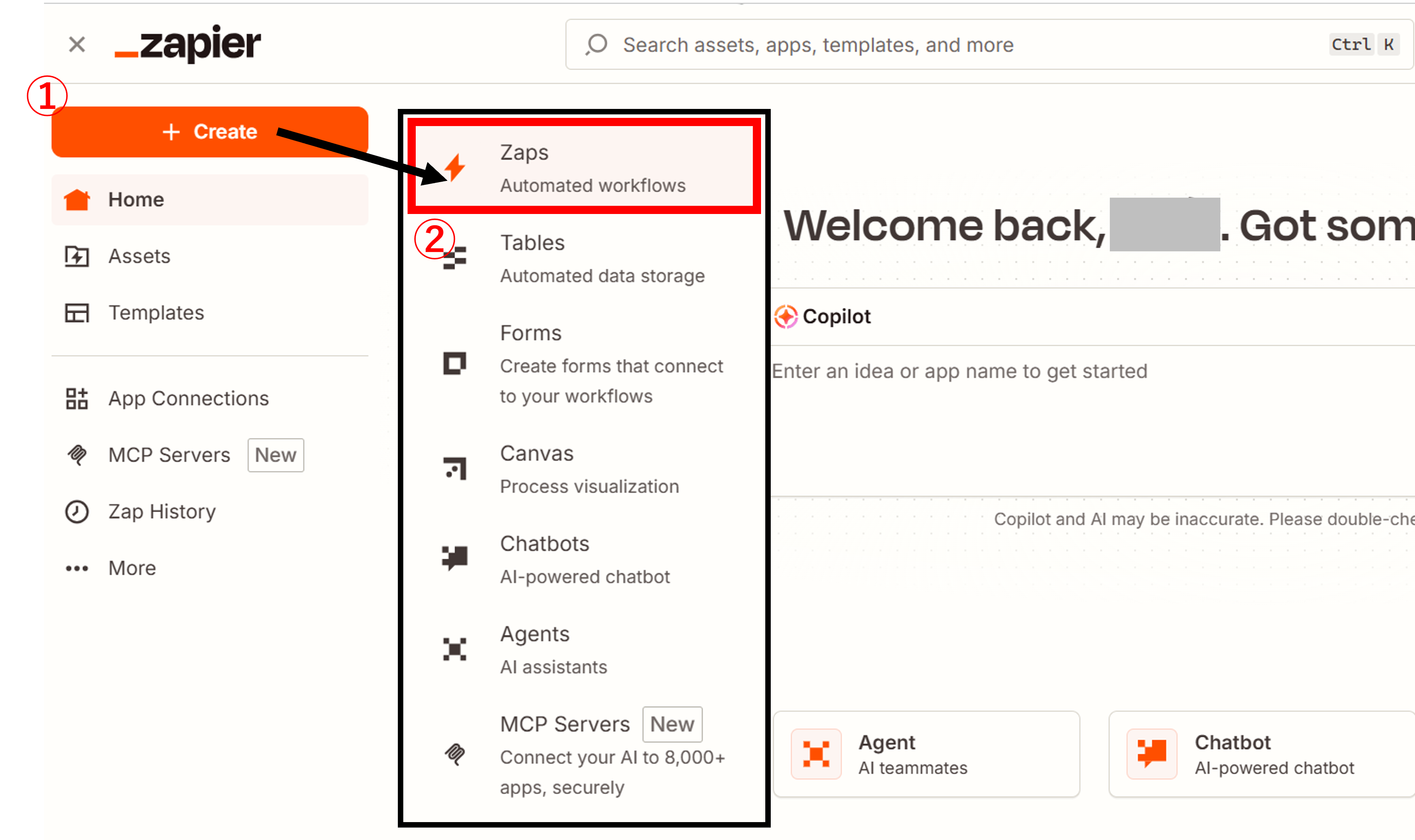Zapierにログインし、「+Create」>「Zaps」を選択して新しいZap(一連のサービス連携の単位のこと)を作成します。