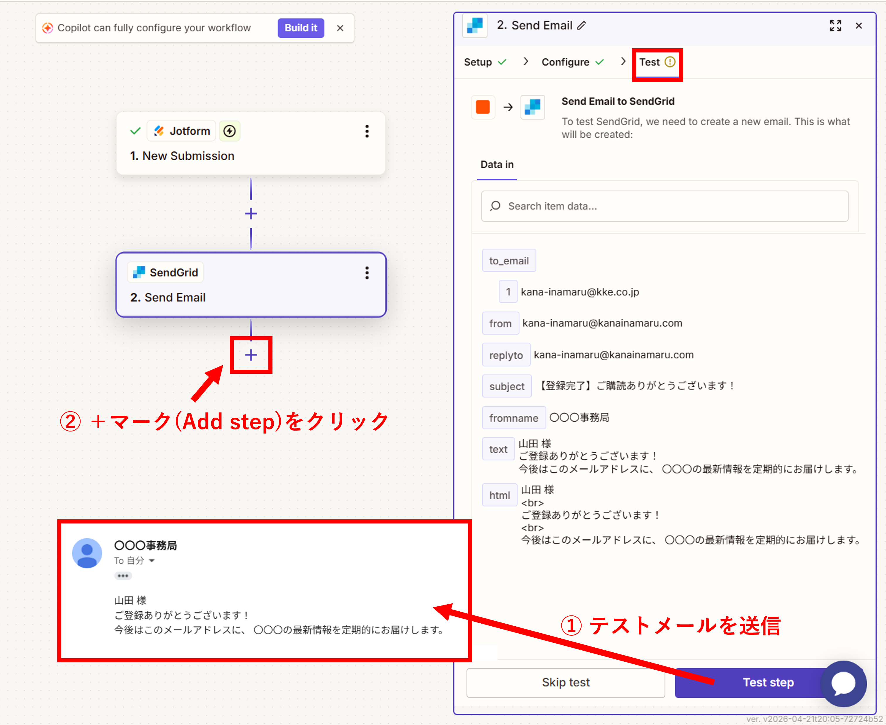 「Configure」で設定した通りにメールが受信できたら、「+(Add Step)」をクリックして次の工程に進みます。