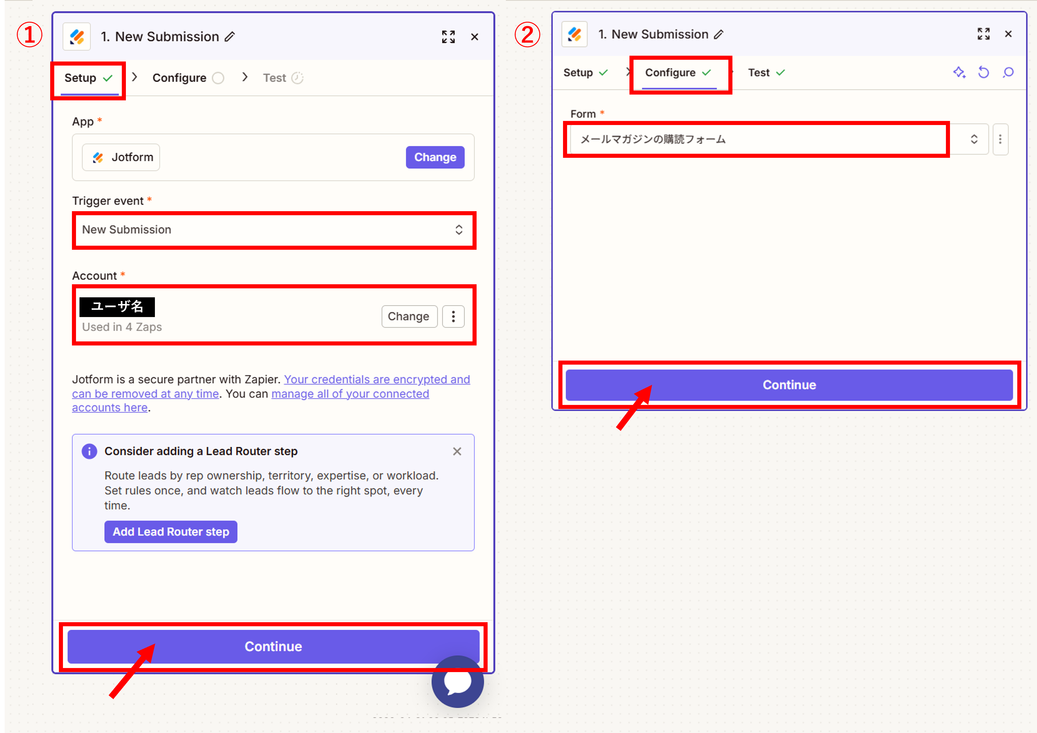 「Setup」で処理のきっかけとなるイベントと連携するJotformアカウントを指定し、「Continue」をクリックします。