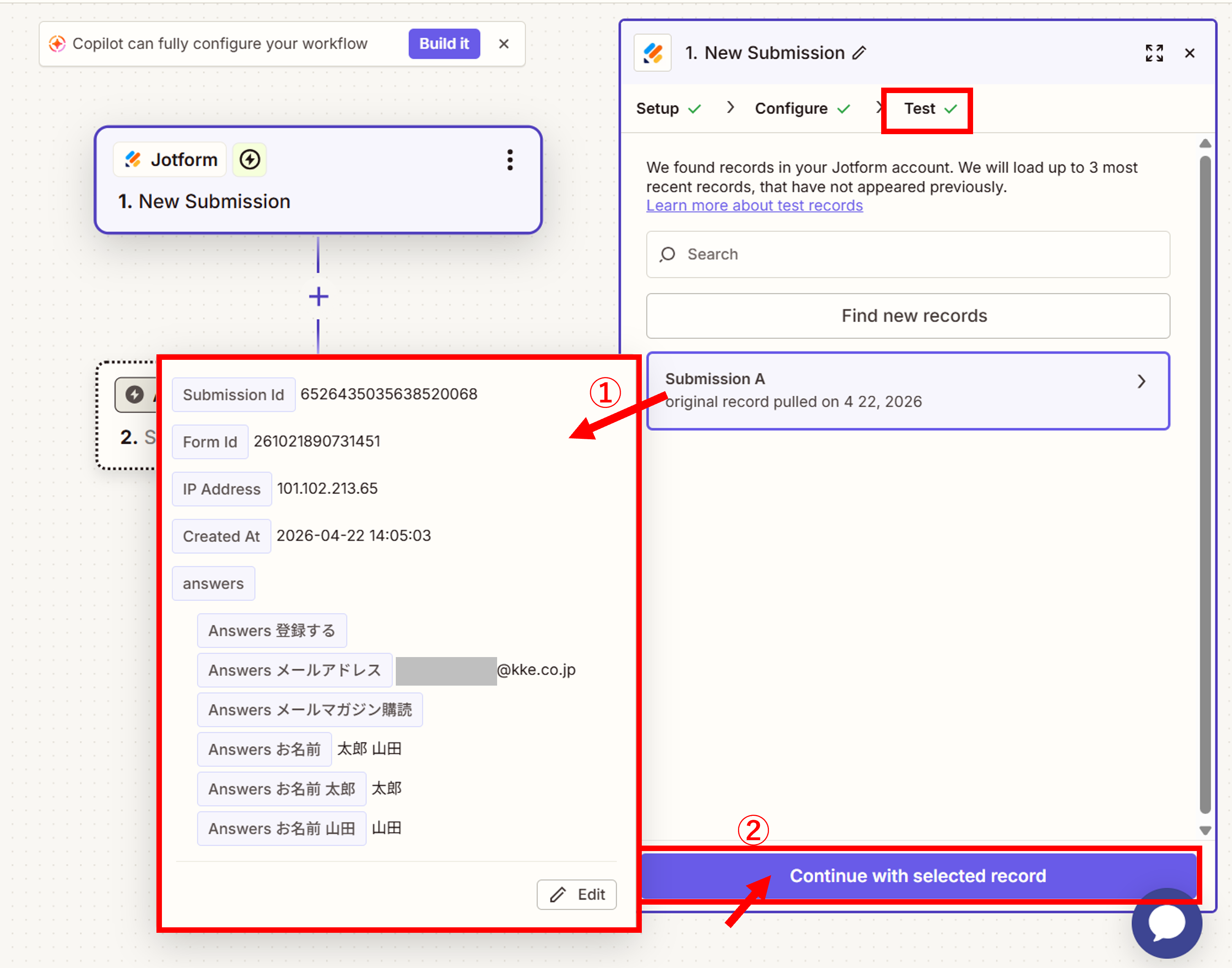 「Test Trigger」ボタンをクリック後、受信したフォームの内容を確認し、問題がなければ「Continue with selected record」ボタンをクリックしてください。